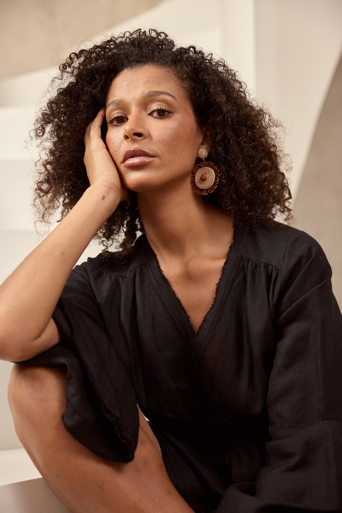 Pair of brown floral earrings on a light gray background