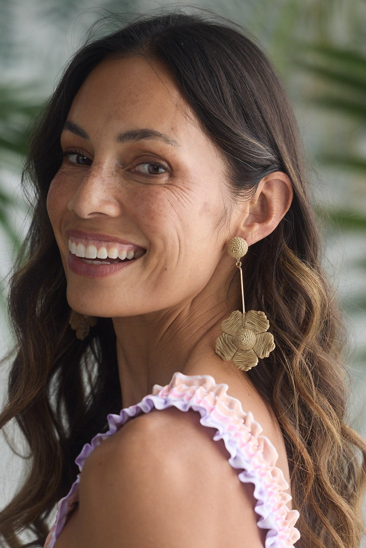 Woman wearing a colorful dress with ruffled sleeves against a leafy green background