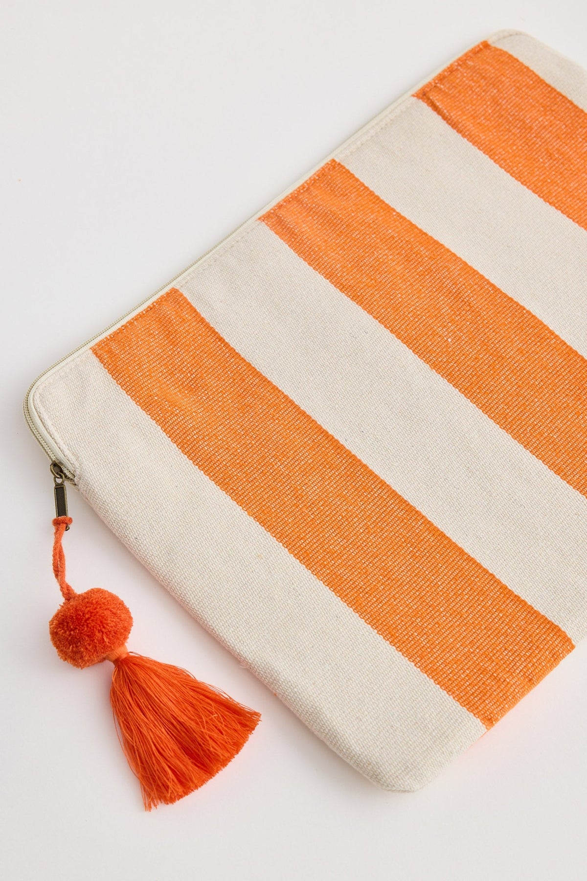 Striped pouch with orange and white pattern and tassel on a light gray background