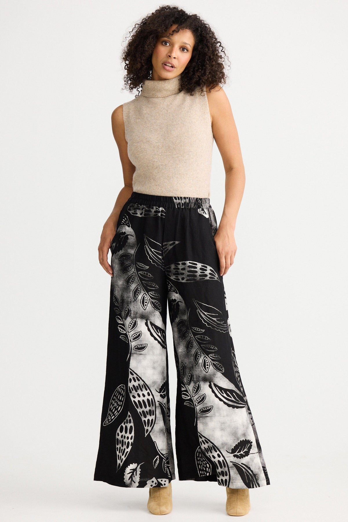 Woman wearing a sleeveless beige top and black patterned pants on a white background