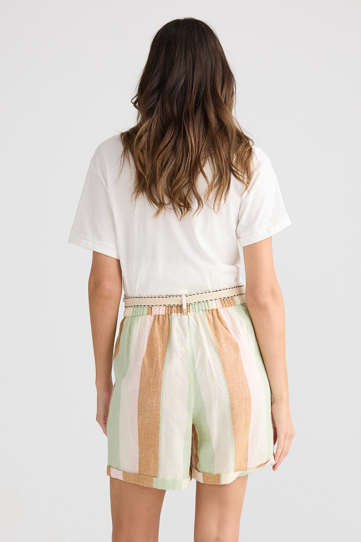 Woman wearing a white top and colorful striped shorts on a plain background